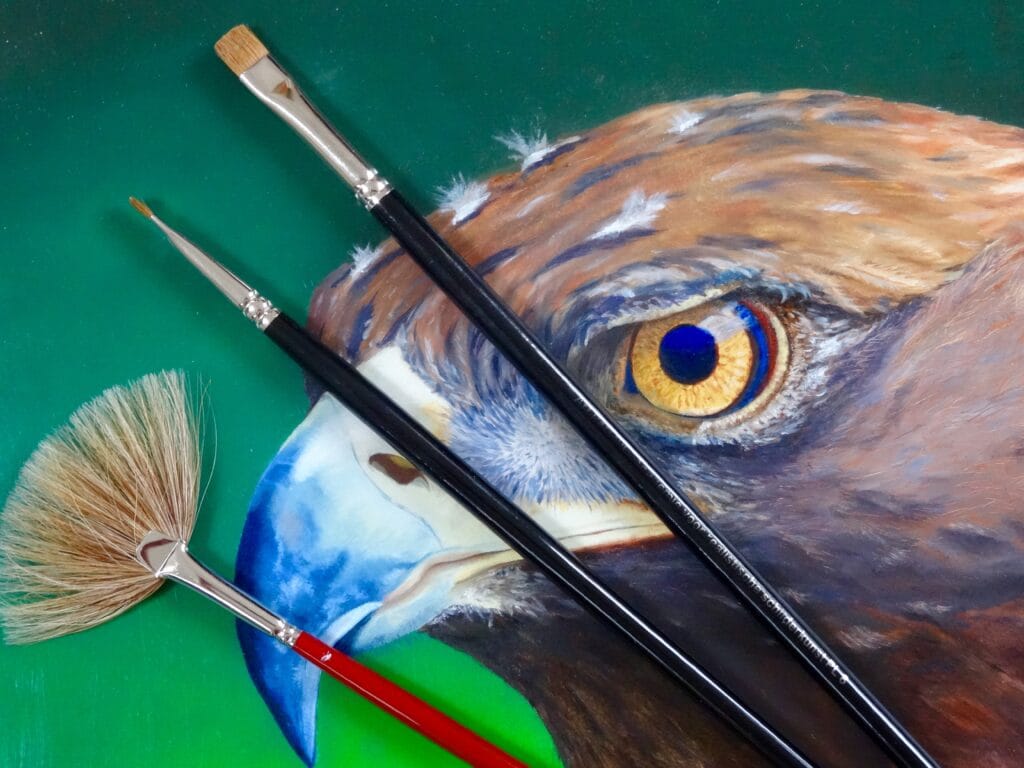 Penseelvoering: Wij halen alles uit je talent. (overigens…talent zien wij als het vermogen om de beste plek voor je ontwikkeling te vinden, een plek waar je je op je gemak voelt en alles op alles wordt gezet om jou veel te leren op een fijne manier) Zo ontdek je welke penseelvoering het beste bij je past. En bij het dier dat je schildert. Daarom maak je kennis met verschillende penseelvoeringen. Van hyper- of fotorealistisch tot een zwierige losse schilderstijl.