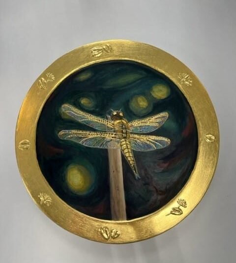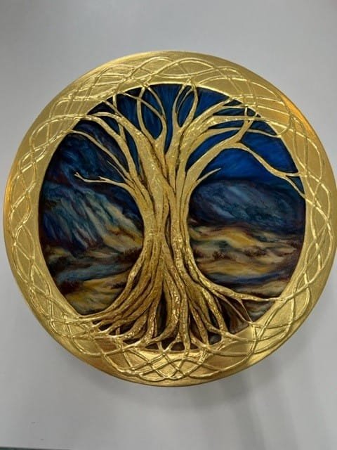 Ei-tempera, 23,75 karaats goud op een authentieke panelen met een doorsnede van 30 cm, 3 cm hoog door Janneke Westra in leerjaar 3