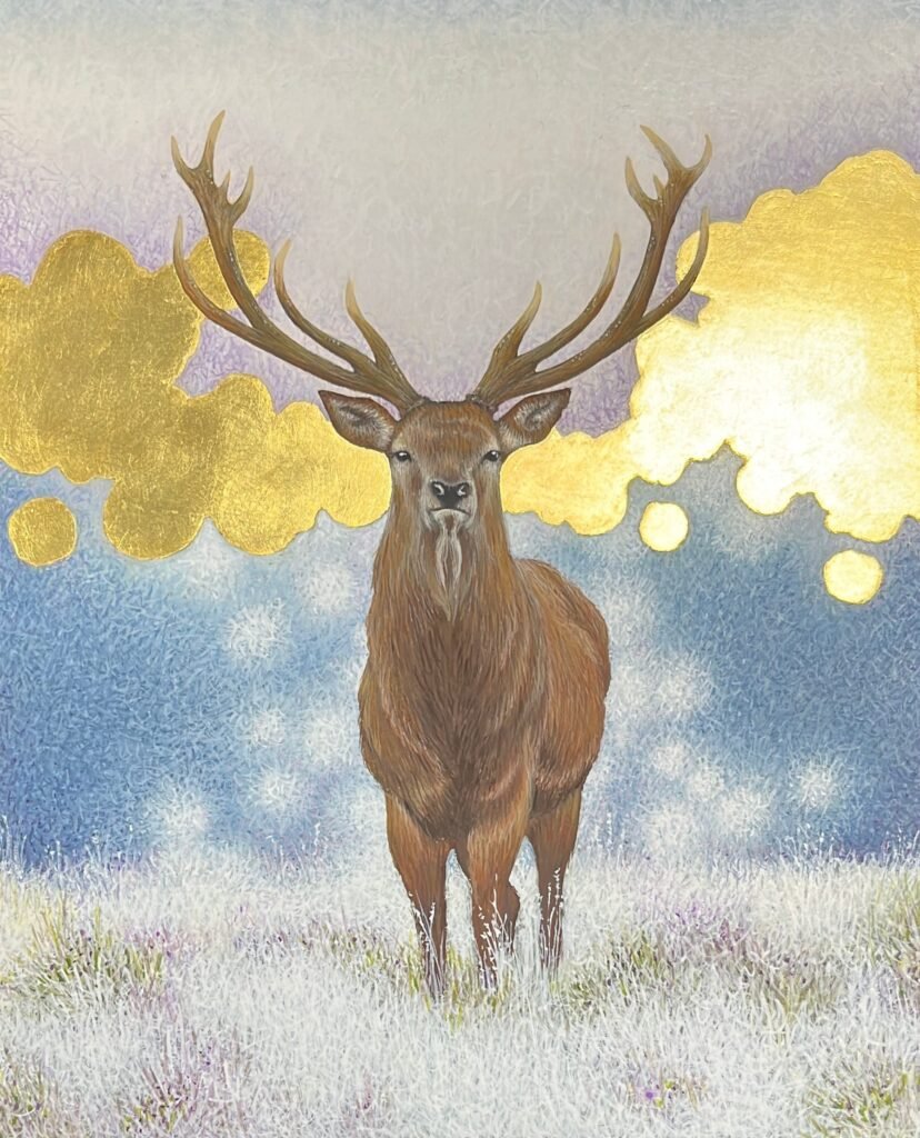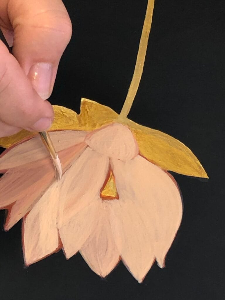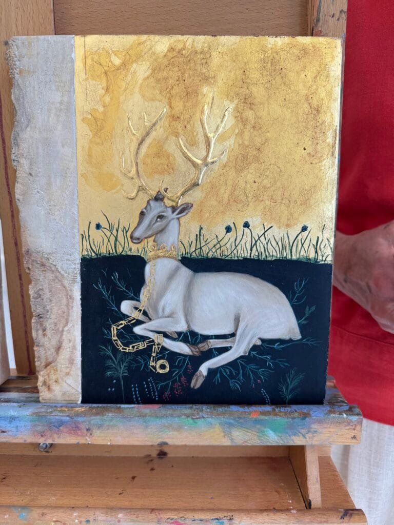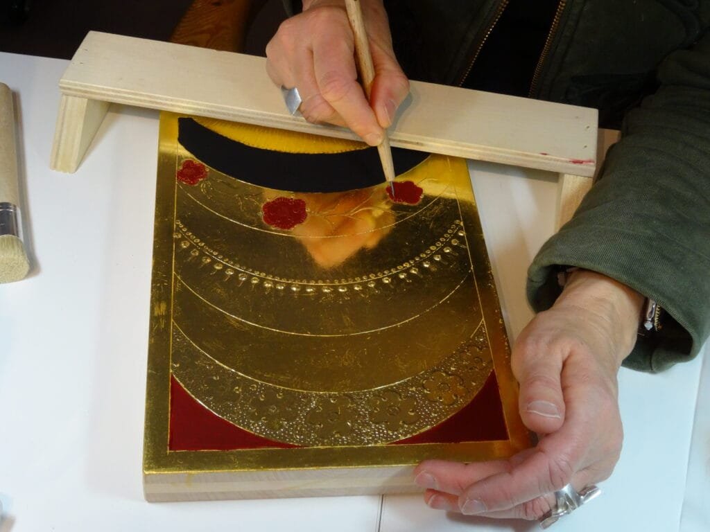 Ei-tempera met puur pigment en drie kleuren goud in de techniek watergilding door Gera Te Bokkel leerjaar 2