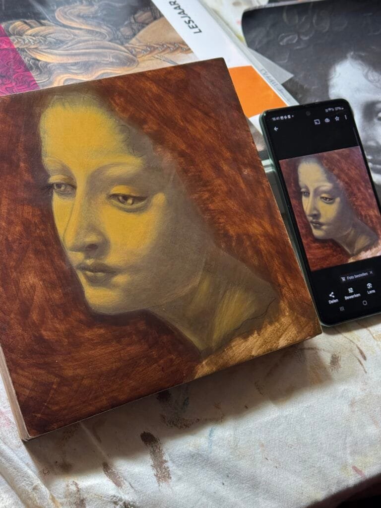 Ei-tempera op authentiek paneel van 20 x 20 x 5 cm. door Benedikte Goethals leerjaar 2