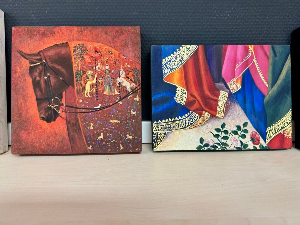 Herma Eilander bij haar oefeningen uit leerjaar 2 met ei-tempera en 23,75 karaats goud in de maten van 10 x 10 x 3 cm. tot aan de maat 45 x 35 x 3 cm.